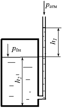 Определить избыточное давление р0и в закрытом резервуаре при усло-вии: h1=0,6 м, плотность жидкости ρ=900 кг/м3, атмосферное давление ратм=0,1 МПа? Чему равно абсолютное давление на дно резервуара при h2=1,0 м. По-строить эпюру избыточного давления н