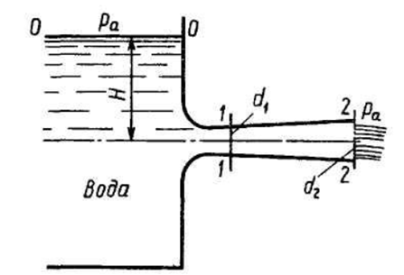 Главная » Учебные материалы » Механика жидкости и газа (МЖГ или Гидравлика) » Решения задач » Несколько классов/семестров » Номер 2 » Вариант 7 » Жидкость вытекает из открытого резервуара в атмосферу через трубу, имеющую плавное сужение до диаметра d1=10 мм, а затем постепенное расширение до d2. Течение происходит под действием напора Н=3 м. Пренебрегая потерями энергии и считая режим течения