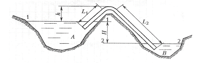 Определить диаметр сифона для пропуска воды из водоема А в водоем В, если разность уровней воды в водоемах Н=1 м, возвышение колена над уровнем воды в водоеме А равно h=1,2 м, длина колена в водоеме А равна L1=3 м, а водоеме В составляет L2=80 м. Расход воды Q=0,4 м3/с.