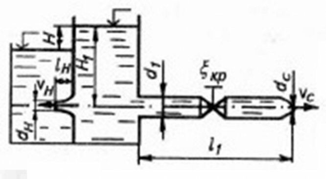 Из открытого резервуара по короткому стальному трубопроводу постоянного поперечного сечения d1 и длиной l1 с краном, коэффициент сопротивления которого ξкр, заканчивающимся соплом диаметром dс=0,5∙d1, вытекает вода в атмосферу. Истечение происходит под напором Н1. С другой стороны к резервуару присоединен коноидальный насадок диаметром выходного сопла dн и длиной lн=5∙dн, истечение из которого происходит при разности уровней в резервуарах Н.