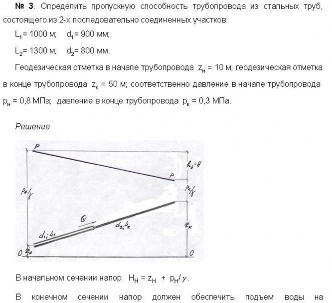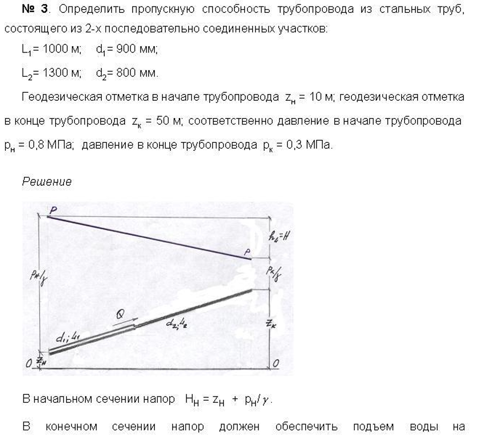 Определить пропускную способность трубопровода из стальных труб, состоящего из 2-х последовательно соединенных участков: L1=1000м; d1=900 мм; L2= 1300м, d2=800мм.Геодезическая отметка в начале трубопровода zn = 10м; геодезическая отметка в конце трубопровода zК = 50 м; соответственно давление в начале трубопровода р„ = 0,8 МПа; давление в конце трубопровода рк = 0,3 МПа..