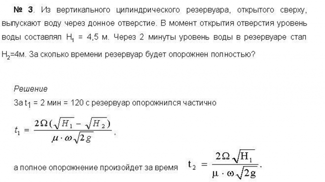 Из вертикального цилиндрического резервуара, открытого сверху, выпускают воду через донное отверстие. В момент открытия отверстия уровень воды составлял Н1 =4,5 м. Через 2 минуты уровень воды в резервуаре стал Н2=4м За сколько времени резервуар будет опорожнен полностью?ДЕМО