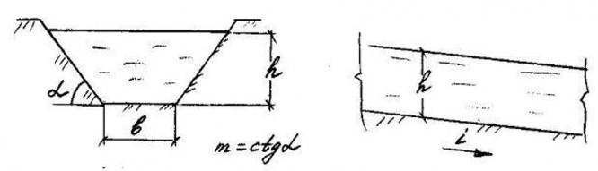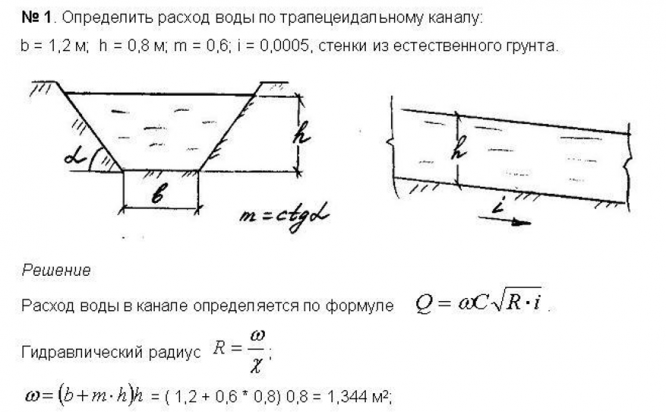 Определить расход воды по трапецеидальному каналу: b = 1,2 м; h = 0,8 м; m = 0,6; i = 0,0005, стенки из естественного грунта.