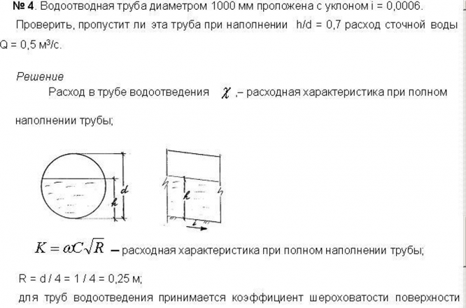 Для студентов по предмету Механика жидкости и газа (МЖГ или Гидравлика)Водоотводная труба диаметром 1000 мм проложена с уклоном i = 0,0006. Проверить, пропустит ли эта труба при наполнении h/d = 0,7 расход сточной воды Q Водоотводная труба диаметром 1000 мм проложена с уклоном i = 0,0006. Проверить, пропустит ли эта труба при наполнении h/d = 0,7 расход сточной воды Q