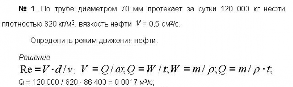 Для студентов по предмету Механика жидкости и газа (МЖГ или Гидравлика)По трубе диаметром 70 мм протекает за сутки 120 000 кг нефти плотностью 820 кг/м3, вязкость нефти V = 0,5 см2/с. Определить режим движения нефти.По трубе диаметром 70 мм протекает за сутки 120 000 кг нефти плотностью 820 кг/м3, вязкость нефти V = 0,5 см2/с. Определить режим движения нефти.