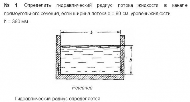 Для студентов по предмету Механика жидкости и газа (МЖГ или Гидравлика)Определить гидравлический радиус потока жидкости в канале прямоугольного сечения, если ширина потока Ь = 80 см, уровень жидкости р = 380мм.Определить гидравлический радиус потока жидкости в канале прямоугольного сечения, если ширина потока Ь = 80 см, уровень жидкости р = 380мм.