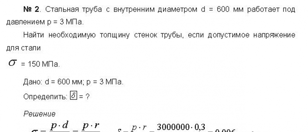 Для студентов по предмету Механика жидкости и газа (МЖГ или Гидравлика)Стальная труба с внутренним диаметром d = 600 мм работает под давлением р = 3 МПа.Найти необходимую толщину стенок трубы, если допустимое напряжение дСтальная труба с внутренним диаметром d = 600 мм работает под давлением р = 3 МПа.Найти необходимую толщину стенок трубы, если допустимое напряжение д