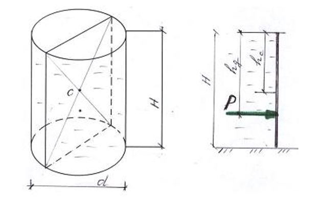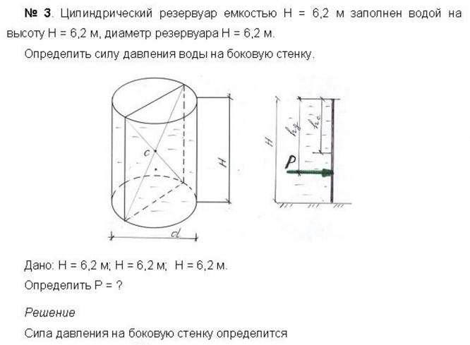 Главная » Учебные материалы » Механика жидкости и газа (МЖГ или Гидравлика) » Решения задач » Несколько классов/семестров » Номер 3 » Вариант 3 » Цилиндрический резервуар емкостью Н = 6,2 м заполнен водой на высоту Н = 6,2 м, диаметр резервуара Н = 6,2 м. Определить силу давления воды на боковую стенку.