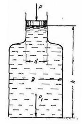 Цилиндрический сосуд заполнен водой на высоту h=0,6 м. Диаметр сосуда D=40 см, диаметр горловины d=10 см. На свободную поверхность жидкости при помощи поршня приложена сила Р=50 Н. Определить силу давления р1 на дно сосуда, абсолютное давление в точк