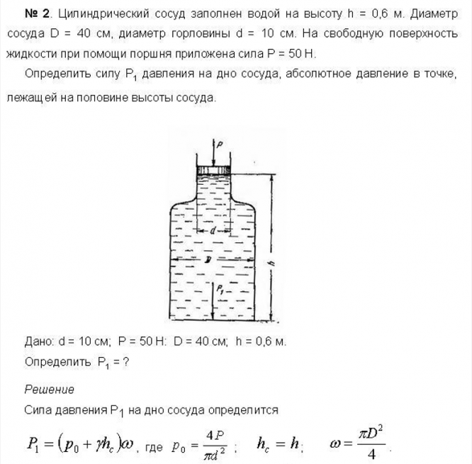Цилиндрический сосуд заполнен водой на высоту h=0,6 м. Диаметр сосуда D=40 см, диаметр горловины d=10 см. На свободную поверхность жидкости при помощи поршня приложена сила Р=50 Н. Определить силу давления р1 на дно сосуда, абсолютное давление в точке, лежащей на половине высоты сосуда.