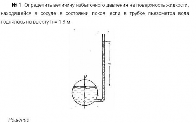 Для студентов по предмету Механика жидкости и газа (МЖГ или Гидравлика)Определить величину избыточного давления (р, Па) на поверхность жидкости, находящейся в состоянии покоя, если в трубке пьезометра вода поднялась на выОпределить величину избыточного давления (р, Па) на поверхность жидкости, находящейся в состоянии покоя, если в трубке пьезометра вода поднялась на вы
