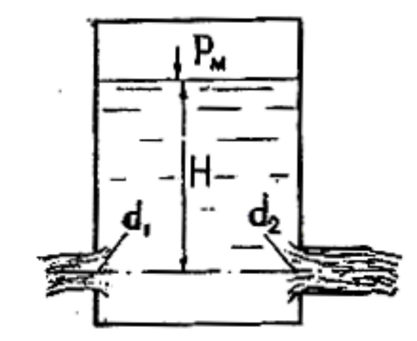 Из резервуара в атмосферу вытекает вода при постоянном напоре через круглое отверстие в тонкой стенке и внешний цилиндрический насадок диаметром d1=d2=20 мм. Определить избыточное давление pм на свободной поверхности воды в резервуаре, если разность расходов насадка и отверстия ΔQ=0,7 л/с, а уровень Н=1,5 м.
