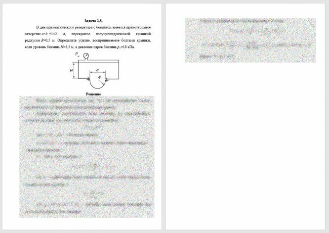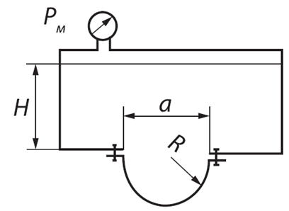 Главная » Учебные материалы » Механика жидкости и газа (МЖГ или Гидравлика) » Решения задач » ГАУСЗ » Несколько классов/семестров » Номер 2 » Вариант 8 » В дне призматического резер­вуара с бензином имеется прямоуголь­ное отверстие a×b =1×2 м, пере­крытое полуцилиндрической крышкой радиусом R=0,5 м. Определить уси­лие, воспринимаемое болтами крышки, если уровень бензина Н=3,5 м, а дав­ление паров бенз