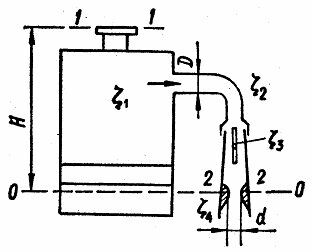 Определить расход воздуха, засасываемого двигателем внутреннего сгорания из атмосферы, при котором вакуум в горловине диффузора составляет рвак=15 кПа, если диаметр трубы D=40 мм, диаметр диффузора d=20 мм, коэффициенты сопротивления воздухоочистителя ξ1=6, колена ξ2=0,3, воздушной заслонки ξ3=0,5 отнесены к скорости в трубе, а коэффициент сопротивления диффузора ξ4=0,04 отнесен к скорости движения воздуха в его горловине (рис. 4.6). Плотность воздуха ρ=1,23 кг/м3. Потерями напора на трение пренебречь.