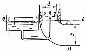 Определить расход бензина (ρ=700 кг/м3) через жиклер карбюратора диаметром d=1 мм (рис. 3.5), если расход засасываемого воздуха Qв=50 л/с, Диаметр всасывающей трубы D=50 мм, диаметр горловины диффузора dс=23 мм, коэффициент сопротивления входа в труб