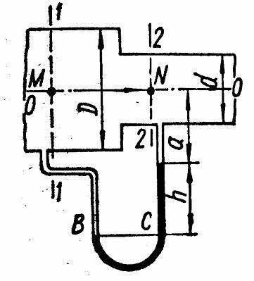 Главная » Учебные материалы » Механика жидкости и газа (МЖГ или Гидравлика) » Решения задач » Несколько классов/семестров » Номер 4 » Вариант 11 » К горизонтальной трубе переменного сечения (D=150 мм, d=50 мм), по которой прокачивается бензин (ρ=750 кг/м3), присоединен дифференциальный манометр, разность уровней ртути в котором h=120 мм (рис. 4.7). Определить расход бензина Q, а также показание