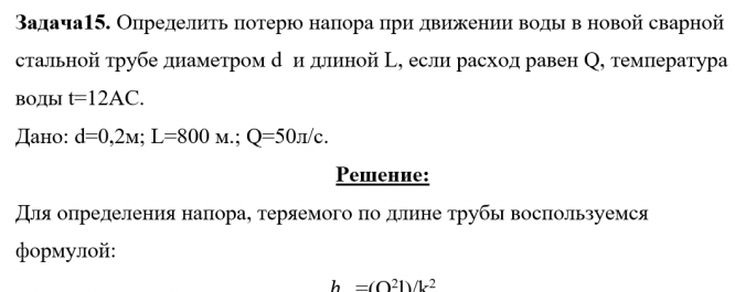 Главная » Учебные материалы » Механика жидкости и газа (МЖГ или Гидравлика) » Решения задач » Несколько классов/семестров » Номер 15 » Определить потерю напора при движении воды в новой сварной стальной трубе диаметром d и длиной L, если расход равен Q, температура воды t=12АС. Дано: d=0,2м; L=800 м.; Q=50л/с.