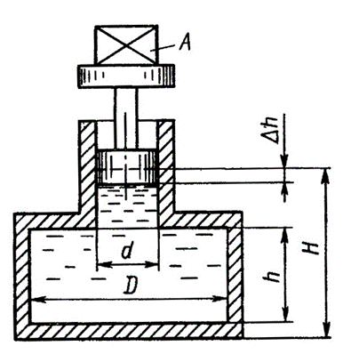 Главная » Учебные материалы » Механика жидкости и газа (МЖГ или Гидравлика) » Решения задач » ИрГАУ » Несколько классов/семестров » Номер 15 » Для определения модуля объемной упругости жидкости Еж используется установка. Резервуар диаметром D = 300 мм, высотой h = 1,3 м и присоединен-ный к нему гидроцилиндр диаметром d = 80 мм заполнены испытываемой жидкостью так, что начальная высота полож