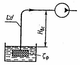 Определить максимальный расход бензина Qн во всасывающем трубопроводе насоса из условия отсутствия на входе насоса кавитации, если высота всасывания Hвс=H, размеры трубопровода - длина l и диаметр d; свойства бензина - плотность ρ=750 кг/м3, давление насыщенных паров pн.п.=40 кПа; атмосферное давление соответствует 750 мм рт.ст. Принять режим течения турбулентным: коэффициент потерь на трение λт=0,03, коэффициент сопротивления приемного фильтра ζф=2.
