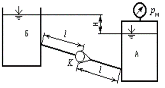 Чему должно быть равно манометрическое давление рм на поверхности жидкости в закрытом резервуаре А для того, чтобы обеспечить подачу жидкости Ж в количестве Q при температуре 20 ºС в открытый резервуар Б. Разность уровней в резервуарах Н. Трубопровод имеет длину 2l и диаметр d. Посередине его установлен обратный клапан К(Рисунок 4), коэффициент местного сопротивления которого ξкл, эквивалентная шероховатость труб Δэ=0,75 мм. Построить пьезометрическую и напорную линии.