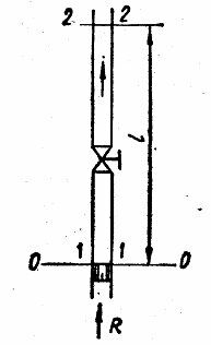 В вертикальной трубе диаметром d=50 мм вода движется под воздействием поршня, который поднимается вверх с ускорением а=4 м/с2 (рис. 5.14). Определить давление жидкости в сечении 2-2, отстоящем в данный момент на расстоянии l=5 м, если в этот момент расход Q=10 л/с, сила, действующая на поршень, R=0,5 кН, шероховатость стенок трубы Δ=0,2 мм, коэффициент сопротивления вентиля ζв=5. Считать, что закон сопротивления квадратичный.
