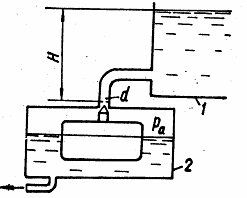 Определить диаметр d отверстия в диафрагме, при котором из топливного бака 1 в поплавковую камеру 2 карбюратор а будет поступать расход бензина (ν=0,9 мм2/с) Q=6,5 см3/с, если напор Н=0,35 м (рис. 6.7).