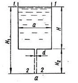 Для студентов по предмету Механика жидкости и газа (МЖГ или Гидравлика)Определить диаметр отверстия в дне бака с квадратным основанием (а×а=1×1 м), при котором вся жидкость, налитая в бак до уровня Н = 1,5 м, вытечет из нОпределить диаметр отверстия в дне бака с квадратным основанием (а×а=1×1 м), при котором вся жидкость, налитая в бак до уровня Н = 1,5 м, вытечет из н
