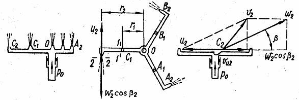 Главная » Учебные материалы » Механика жидкости и газа (МЖГ или Гидравлика) » Решения задач » Несколько классов/семестров » Номер 7.5 » Сегнерово колесо (рис. 7.9) установки для мойки автомобилей снизу вращается в горизонтальной плоскости под действием реакций струй, вытекающих из сопел A2, B2; С2, оси которых перпендикулярны к радиальным трубкам и наклонены под углом β=30° к плоскос