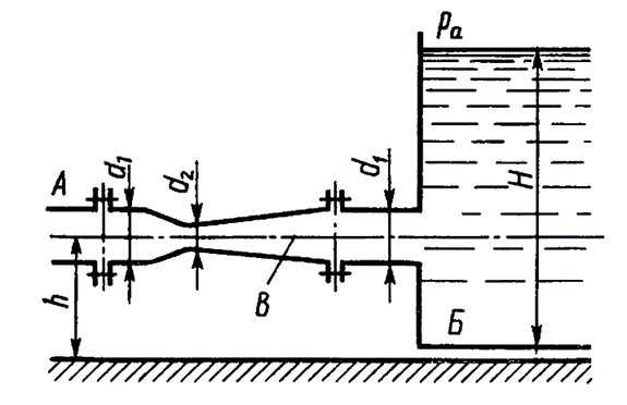 Для измере­ния расхода воды, которая подается по трубе А в бак Б, установлен расходомер Вентури В. Определить мак­симальный расход, который можно пропускать через дан­ный расходомер при условии отсутствия в нем кавитации, если температура воды t=60°С (давление насыщенных паров соответствует hнп=2 м вод. ст.). Уровень воды в баке поддерживается постоянным, равным H=1,5 м; h=0,5 м. Размеры расходомера: d1=50 мм; d2=20 мм. Атмосферное давление принять рав­ным 760 мм рт. ст. Коэффициент сопротивления диффузора ξдиф=0,2.