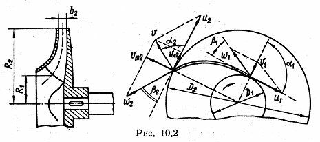 Рабочее колесо центробежного насоса, вращающееся с частотой n=1450 мин-1, имеет следующие размеры (рис. 10.2): диаметр внешней окружности D2=150 мм, средний диаметр окружности, на которой расположены входные кромки лопастей, D1=50 мм, ширина канала р