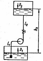 Центробежный насос поднимает воду на высоту hг=6 м по трубам l1=20 м, d1=0,2 м (λ1=0,02) и l2=100 м, d2=0,15 м (λ2=0,025) (рис. 10.8). Определить подачу насоса при n1=900 мин-1. Сравнить величины мощности, потребляемой насосом при уменьшении его подачи на 25 % дросселированием задвижкой или изменением частоты вращения, если р1=р2=ра.