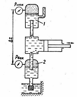 Главная » Учебные материалы » Механика жидкости и газа (МЖГ или Гидравлика) » Решения задач » Несколько классов/семестров » Номер 11.8 » При испытании насоса одностороннего действия (рис. 11.5), диаметр цилиндра которого D=220 мм, ход поршня h=280 мм, измерены: частота вращения n=60 мин-1, среднее показание манометра pман=0,23 МПа, среднее показание вакуумметра pвак=40 кПа, вертикальн