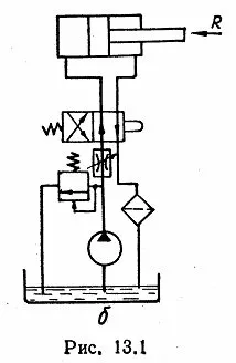 Для студентов по предмету Механика жидкости и газа (МЖГ или Гидравлика)Произвести расчет объемного гидропривода, схема которого показана на рис. 13.1 б, при следующих исходных данных: усилие на штоке гидроцилиндра R=200 кПроизвести расчет объемного гидропривода, схема которого показана на рис. 13.1 б, при следующих исходных данных: усилие на штоке гидроцилиндра R=200 к