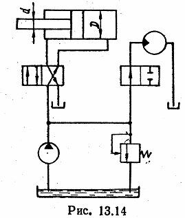 Для студентов по предмету Механика жидкости и газа (МЖГ или Гидравлика)В объемном гидроприводе (рис. 13.14) гидроцилиндра (D=125 мм, d=63 мм) и гидромотор с рабочим объемом Vо=20 см3 соединены параллельно. Потери давленияВ объемном гидроприводе (рис. 13.14) гидроцилиндра (D=125 мм, d=63 мм) и гидромотор с рабочим объемом Vо=20 см3 соединены параллельно. Потери давления