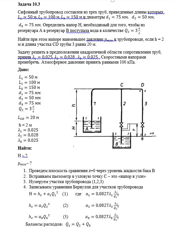 Найти при этом напоре наименьшее давление в трубопроводе, если h = 2 м и длина участка CD трубы 3 равна 20 м.