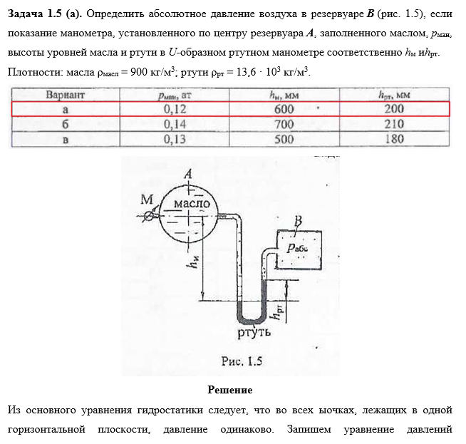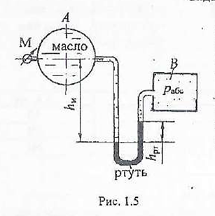 Задача 1.5. Определить абсолютное давление воздуха в резервуаре В (рис. 1.5), если показание манометра, установленного по центру резервуара А, заполненного маслом, рман, высоты уровней масла и ртути в U-образном ртутном манометре hм и hрт.