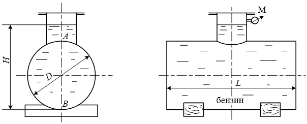 Задача 3.5 (а). В горизонтальной цистерне диаметром D и длиной L хранится бензин. Уровень бензина в цистерне находится на высоте Н от дна. Избыточное давление паров бензина на поверхности соответствует показанию манометра рман (рис. 3.5).