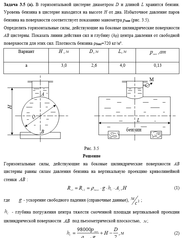 Задача 3.5 (а). В горизонтальной цистерне диаметром D и длиной L хранится бензин. Уровень бензина в цистерне находится на высоте Н от дна. Избыточное давление паров бензина на поверхности соответствует показанию манометра рман (рис. 3.5). Определить горизонтальные силы, действующие на боковые цилиндрические поверхности АВ цистерны. Показать линии действия сил и глубину (hD) центра давления от свободной поверхности для этих сил. Плотность бензина ρбенз=720 кг/м³..