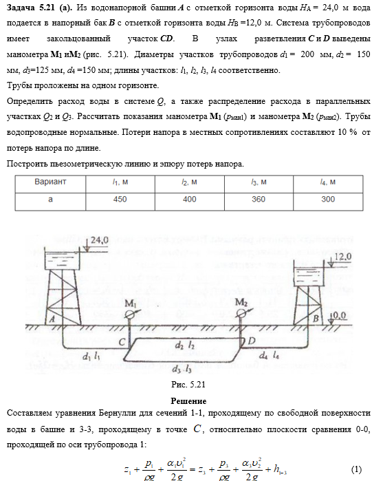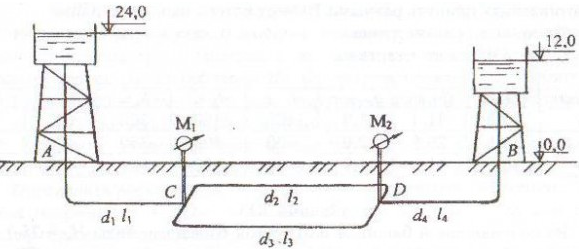 Задача 5.21 (а). Из водонапорной башни A с отметкой горизонта воды HА = 24,0 м вода подается в напорный бак В с отметкой горизонта воды HВ =12,0 м. Система трубопроводов имеет закольцованный участок CD. В узлах разветвления C и D выведены манометра М1 иМ2 (рис. 5.21). Диаметры участков трубопроводов d1 = 200 мм, d2 = 150 мм, d3=125 мм, d4 =150 мм; длины участков: l1, l2, l3, l4 соответственно.