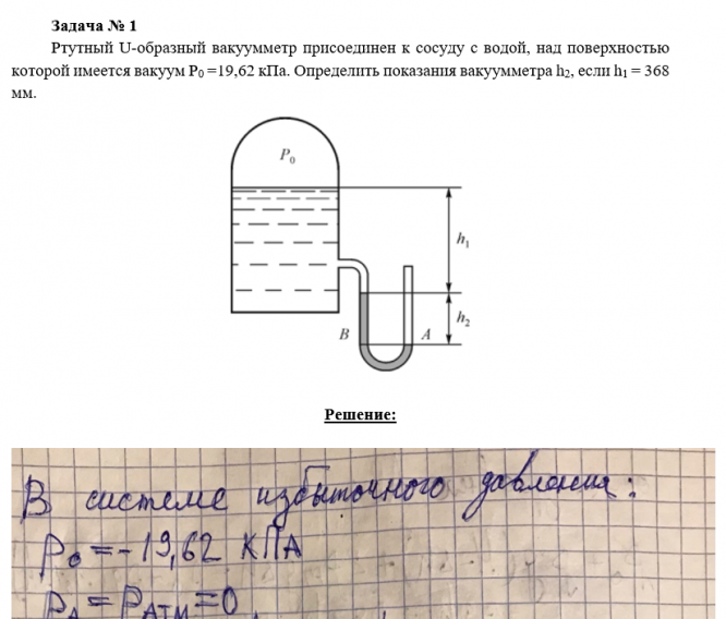 Главная » Учебные материалы » Механика жидкости и газа (МЖГ или Гидравлика) » Решения задач » Несколько классов/семестров » Номер 1 » Ртутный U-образный вакуумметр присоединен к сосуду с водой, над поверхностью которой имеется вакуум P0 =19,62 кПа. Определить показания вакуумметра h2, если h1 = 368 мм.