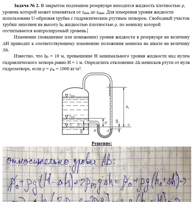 Задача 2: В закрытом подземном резервуаре находится жидкость плотностью ρ, уровень которой может изменяться от zmin до zmax. Для измерения уровня жидкости использована U-образная трубка с гидравлическим ртутным затвором. Свободный участок трубки заполнен на высоту h0 жидкостью плотностью ρ, по мениску которой отсчитывается контролируемый уровень.
