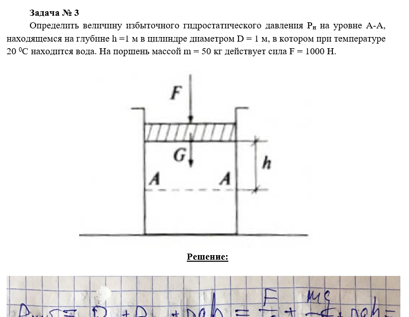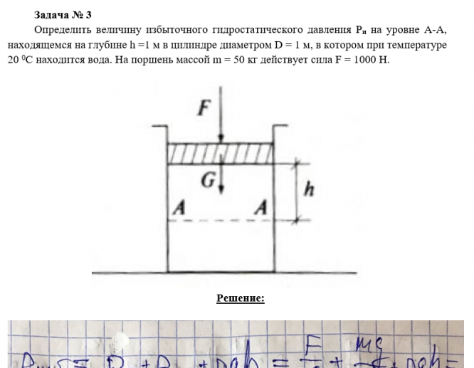 Задача 3: Определить величину избыточного гидростатического давления Ри на уровне А-А, находящемся на глубине h =1 м в цилиндре диаметром D = 1 м, в котором при температуре 20 0С находится вода. На поршень массой m = 50 кг действует сила F = 1000 H.