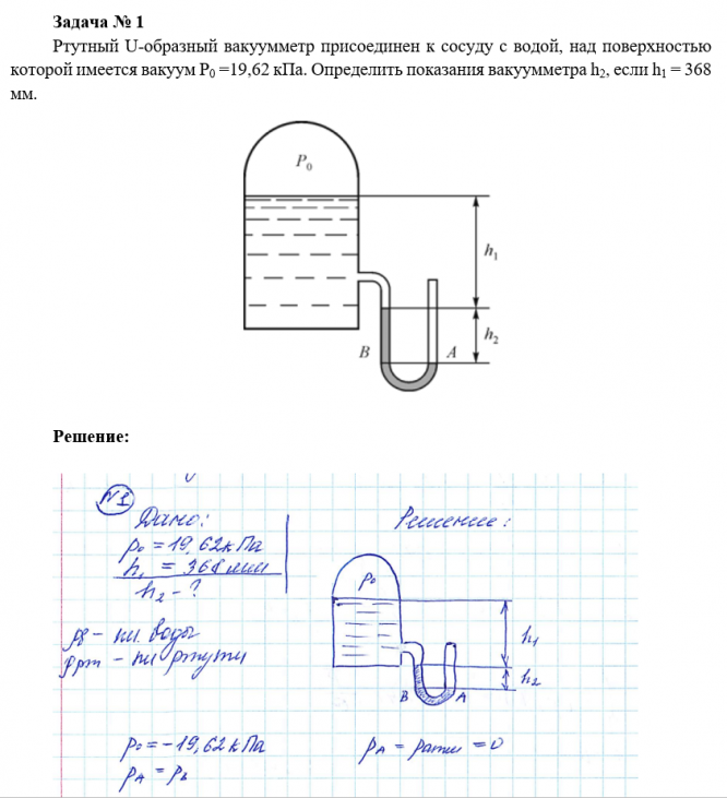 Главная » Учебные материалы » Механика жидкости и газа (МЖГ или Гидравлика) » Решения задач » Несколько классов/семестров » Номер 1 » Ртутный U-образный вакуумметр присоединен к сосуду с водой, над поверхностью которой имеется вакуум P0 =19,62 кПа. Определить показания вакуумметра h2, если h1 = 368 мм.