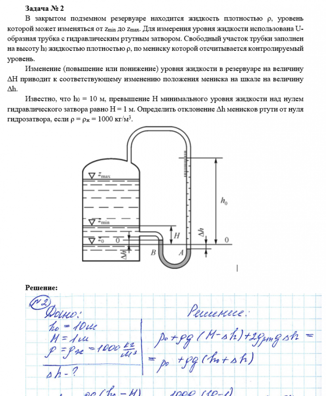 Задача 2: В закрытом подземном резервуаре находится жидкость плотностью ρ, уровень которой может изменяться от zmin до zmax. Для измерения уровня жидкости использована U-образная трубка с гидравлическим ртутным затвором. Свободный участок трубки заполнен на высоту h0 жидкостью плотностью ρ, по мениску которой отсчитывается контролируемый уровень.
