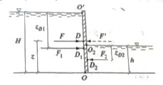 Плоский затвор перегораживает прямоугольный канал шириной b = 10 м. Глубина воды перед затвором Н = 5 м, за затвором h = 2 м. Определить силу избыточного гидростатического давления на затвор и точку ее приложения.