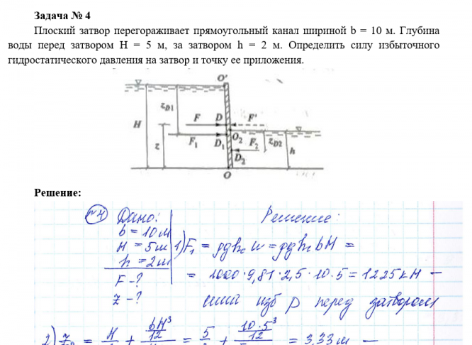 Задача 4: Плоский затвор перегораживает прямоугольный канал шириной b = 10 м. Глубина воды перед затвором Н = 5 м, за затвором h = 2 м. Определить силу избыточного гидростатического давления на затвор и точку ее приложения.