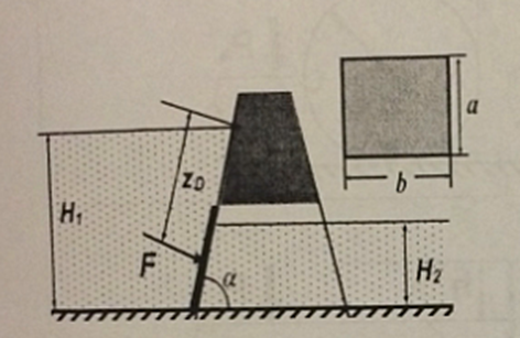 Определить по данным таблицы 4 равнодействующую силу избыточного давления воды на плоский затвор, перекрывающий отверстие трубы. Определить координату точки приложения силы давления воды zD на указанную сторону затвора. Дано: Н1=4 м, Н2=0, α=600, форма сечения трубы – прямоугольник с а=2 м, b=1 м, левая сторона затвора Определить Fизб, zD.