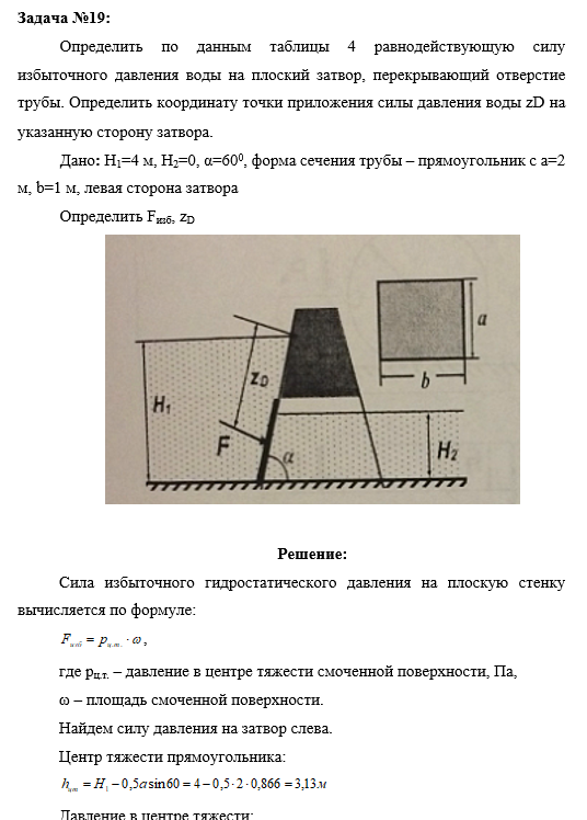 Задача 19: Определить по данным таблицы 4 равнодействующую силу избыточного давления воды на плоский затвор, перекрывающий отверстие трубы. Определить координату точки приложения силы давления воды zD на указанную сторону затвора.