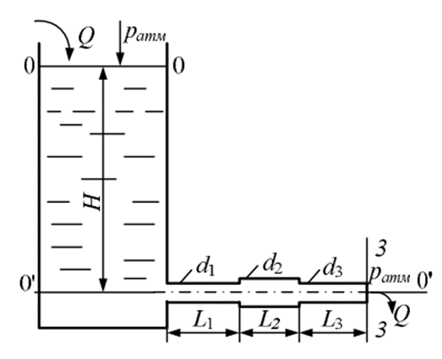 Главная » Учебные материалы » Механика жидкости и газа (МЖГ или Гидравлика) » Решения задач » ДВГУПС » Несколько классов/семестров » Номер 6 » Вариант 221 » Из открытого резервуара, в котором поддерживается посто­янный уровень, по стальному трубопроводу с эквивалентной шероховатостью Δэ - 0,1 мм, со­стоящему из труб различного диаметра d1 = 25 мм, d2 = 40 мм и d3 = 32 мм и различной длины L1 = 1,5 м, L2