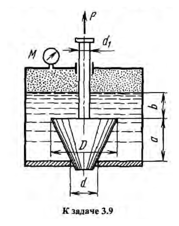 Отверстие в дне сосуда, содержащего масло относительной плотностью δ = 0,83, закрыто конической пробкой с размерами D = 100 мм, d = 50 мм и а = 100 мм, укрепленной на штоке диаметром d1 = 25 мм. Уровень масла расположен выше пробки (b = 50 мм).  1.    Определить начальное усилие Р, необходимое для подъема пробки избыточном давлении в сосуде М = 10 кПа.  2.    Найти избыточное давление М, при котором усилие P окажется равным нулю. Ответ. 1. Р = 13,5 Н; 2. M=1,04 кПа.